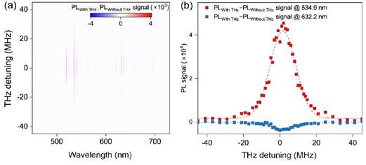 3. 拓展频谱感知功能,建立太赫兹量子测量新方法:围绕太赫兹频率与谱信息感知这一关键科学问题,进一步发展了基于里德堡原子光致发光光谱的太赫兹光谱进行快速表征的方法,通过分析太赫兹场作用前后的光谱差分,同步获取太赫兹场的频率与强度信息。该方法以原子能级为基准,为建立可溯源的太赫兹量子传感体系提供了新途径。